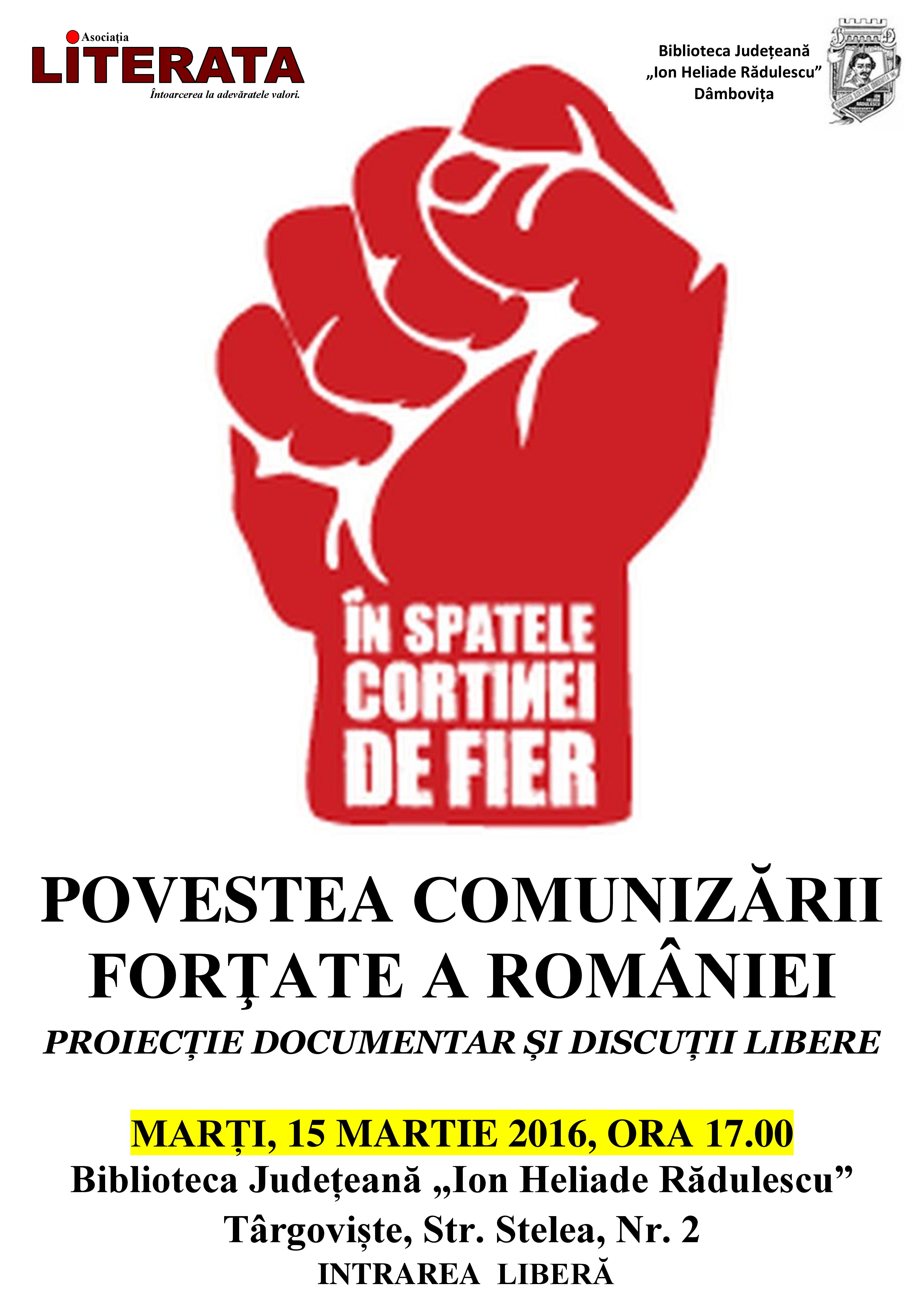 Asociația Literata a organizat în data de marți, 15 martie 2016, începând cu ora 17.00, la Biblioteca Județeană "Ion Heliade Rădulescu" din Târgoviște, proiecția documentarului "În spatele cortinei de fier". Miza principală a filmului este familiarizarea publicului cu imaginea reală, nemascată a comunismului, departe de idealismul promovat de nostalgicii sau promotorii săi actuali. Se dorește astfel a se compensa carența gravă de informație privitoare la trecutul nostru recent, existentă mai ales în rândul tinerilor. Astfel, prin filmul „În spatele cortinei de fier” am dorit să prezentăm publicului târgoviștean povestea comunizării forţate a României, urmărind principalele moduri prin care a avut loc destructurarea societății din perioada 1944-1951: de la desfiinţarea proprietăţii private, reforma agrară, reforma monetară, naţionalizarea obiectivelor industriale și decapitarea armatei, la fraudarea masivă a alegerilor electorale în favoarea Partidului Comunist, desfiinţarea pluralismului politic şi a libertăţii presei, subordonarea economiei intereselor Uniunii Sovietice şi abolirea monarhiei. După vizionarea documentarului de 50 de minute au avut loc discuții libere pe acestă temă.